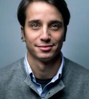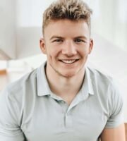 A hand reaches towards a laptop with a website open displaying a banner advertisement. Beside the laptop, a glass with a straw is visible. The scene is dimly lit, possibly in a cafe or home environment. A smartwatch is worn on the wrist of the hand.